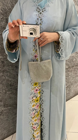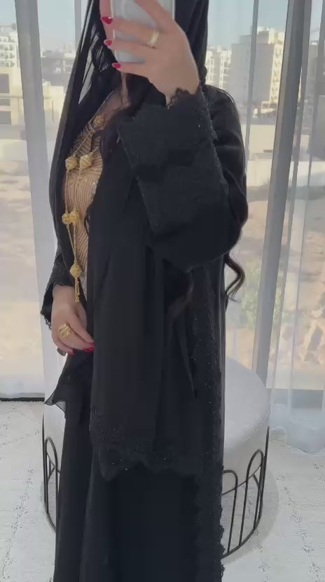 Al Reem Abaya made from premium Korean Nada fabric, featuring exquisite lace detailing on the chest and sleeves. Soft, lightweight, and perfect for a luxurious everyday look.